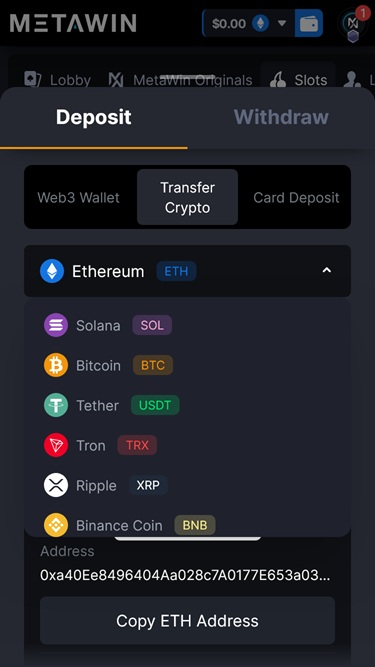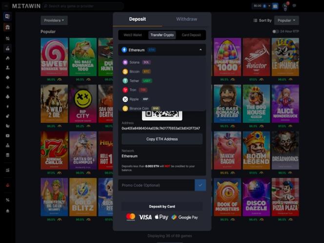 كما ذكرنا سابقًا، يُعد Metawin كازينو إلكترونيًا مُركزًا حصريًا على العملات المشفرة، مما يعني أنه لا يمكنك استخدام أي طرق دفع تقليدية لإدارة أموالك. بدلًا من ذلك، يمكنك استخدام أكثر من 25 عملة مشفرة متاحة، منها بيتكوين ، وتيثر ، وسولانا ، ودوجكوين ، وإيثريوم ، و USD Coin ، وريبل ، ولايتكوين ، وإيوس . يوفر الموقع محفظة Web3، كما يتيح لك استخدام محفظتك الخاصة ومعاملات MoonPay.