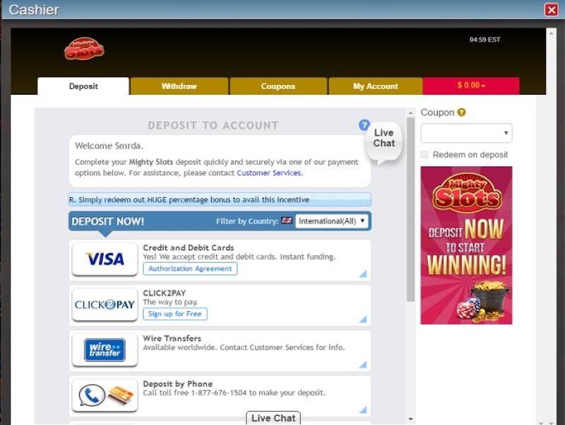 يتم تشغيل Mighty Slots Casino بواسطة Real Time Gaming ، مما يمنح الكازينو منصة يمكن الوصول إليها من خلال برنامج قابل للتنزيل بالإضافة إلى منصة لعب فورية متاحة من خلال متصفح الويب الخاص بك.خيارات الخدمات المصرفية في Mighty Slots