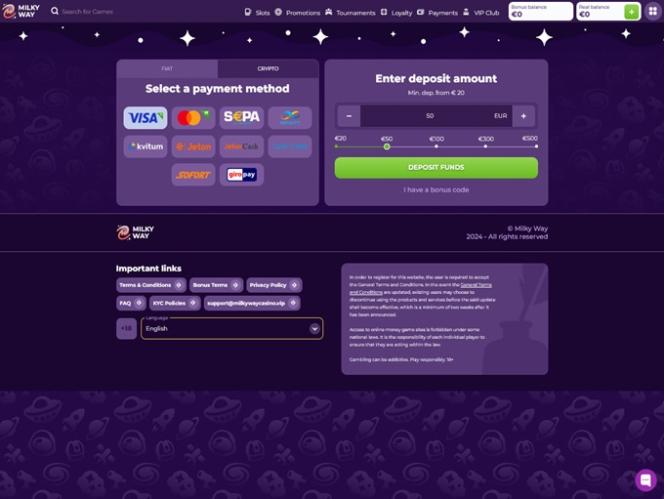 لا يقبل موقع Milky Way Casino اللاعبين من البلدان التالية: ألاباما, ألاسكا, ساموا الأمريكية, أريزونا, أركنساس, أروبا, أستراليا, النمسا, كاليفورنيا, كولورادو, كونيتيكت, كوراساو, قبرص, دي سي, ديلاوير, فلوريدا, فرنسا, غيانا الفرنسية, بولينيزيا الفرنسية, جورجيا, غوادلوب, غوام, هاواي, أيداهو, إلينوي, إنديانا, أيوا, إيران, كانساس, كنتاكي, كوريا، جمهورية كوريا الديمقراطية الشعبية, لويزيانا, مين, مارتينيك, ماريلاند, ماساتشوستس, مايوت, ميشيغان, مينيسوتا, ميسيسيبي, ميسوري, مونتانا, ميانمار, نبراسكا, هولندا, نيفادا, كاليدونيا الجديدة, نيو هامبشاير, نيوجيرسي, نيو مكسيكو, نيويورك, كارولينا الشمالية, داكوتا الشمالية, جزر ماريانا الشمالية, أوهايو, أوكلاهوما, أونتاريو, أوريغون, بنسلفانيا, بورتوريكو, جمع شمل, رود آيلاند, روسيا, سانت مارتن, كارولينا الجنوبية, داكوتا الجنوبية, إسبانيا, تينيسي, تكساس, المملكة المتحدة, الولايات المتحدة, جزر الولايات المتحدة الصغيرة النائية, يوتا, فيرمونت, جزر فيرجن الأمريكية, فرجينيا, واليس وفوتونا, واشنطن, ولاية فرجينيا الغربية, ويسكونسن و وايومنغ.