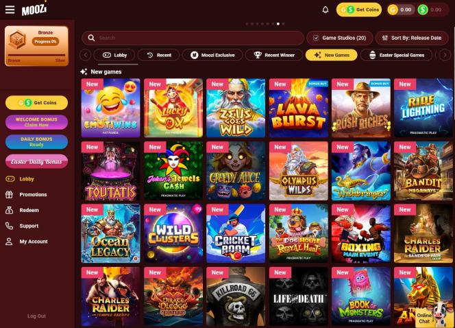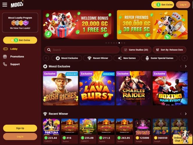 أُطلق كازينو موزي عام ٢٠٢٤، وهو كازينو اجتماعي يُلبي احتياجات جمهور الولايات المتحدة الأمريكية بشكل أساسي، باستثناء بعض الولايات المُقيّدة. يتميز كازينو موزي بقائمة ألعاب غنية تُقدّم مئات من ألعاب القمار الإلكترونية، وألعاب كراش، وألعاب حصرية. يُمكن للاعبين الاستمتاع بالعديد من المكافآت والعروض الترويجية، والمشاركة في فعاليات مُتنوّعة لربح عملات ذهبية وعملات سويبس مجانًا.