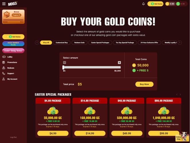 بمجرد إنشاء حسابك في كازينو موزي، يمكنك الاستمتاع بالعديد من المكافآت والعروض الترويجية التي ستُبقيك منشغلاً طوال إقامتك. سيحصل اللاعبون المبتدئون على مكافأة ترحيبية كبيرة، تمنحهم بدايةً مميزة من خلال منحهم عملات ذهبية وعملات سحب مجانية.