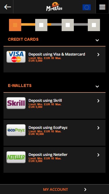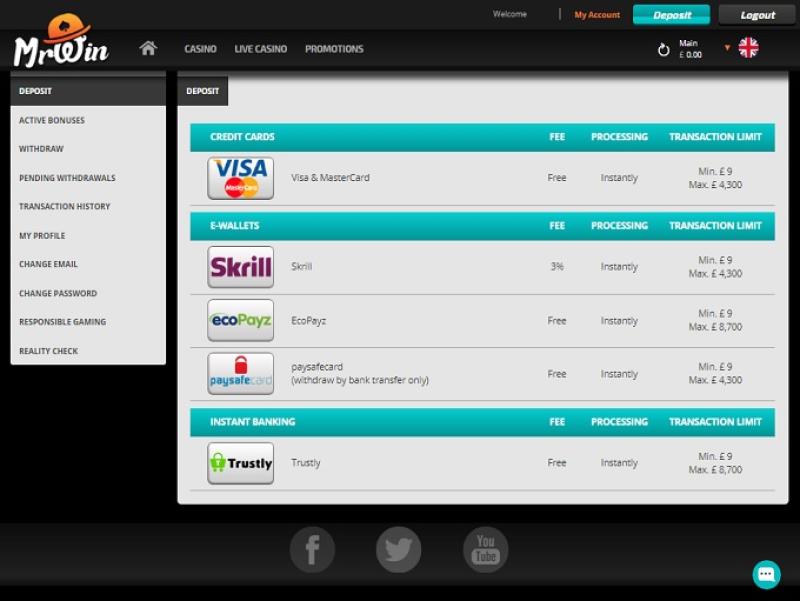 أنا سعيدٌ جدًا بالنظام المصرفي في كازينو "مستر وين"، الذي يوفر بطاقات الائتمان والمحافظ الإلكترونية والتحويل المصرفي. يُحدد الموقع مهلة انتظار للأرباح لمدة 48 ساعة، وهو أمرٌ مزعج، ولكن يتم تحويل الأرباح عبر المحافظ الإلكترونية فورًا. يوجد حدٌّ شهريٌّ للسحب قدره 20,000 يورو، مع أنه ليس من الواضح ما إذا كان هذا ينطبق على الجوائز الكبرى التراكمية.