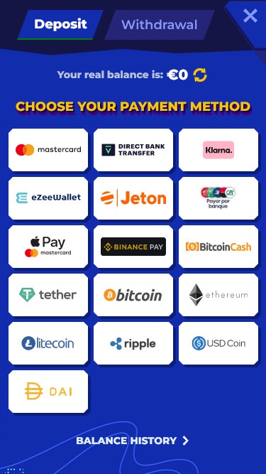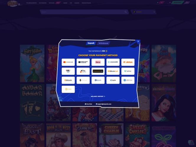 يعتمد أمين الصندوق في الكازينو على البلد ولكنه يدعم العديد من خيارات الدفع للإيداع والسحب بما في ذلك طرق الدفع بالعملة المشفرة وبطاقات الدفع والتحويلات البنكية والمحافظ الإلكترونية والمزيد: