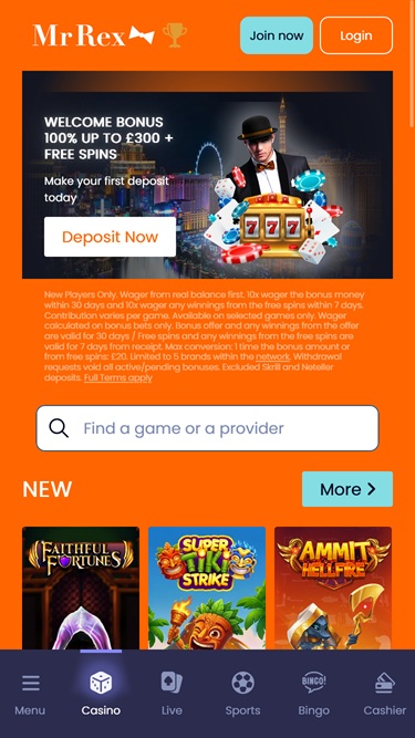 يقدم الكازينو منصة رائعة مصممة بنمط مشرق مع خطوط رائعة وتفاصيل برتقالية زاهية. يوفر تصميم الشريط الجانبي الأيسر مساحة واسعة في المنطقة المركزية من الواجهة لعرض الشرائح الترويجية والألعاب وجميع معلومات الكازينو الإضافية. يتميز الكازينو بأجواء راقية، ويمكننا القول بكل ثقة إن السيد ريكس هو السيد الحقيقي!