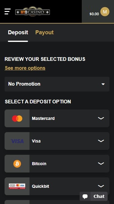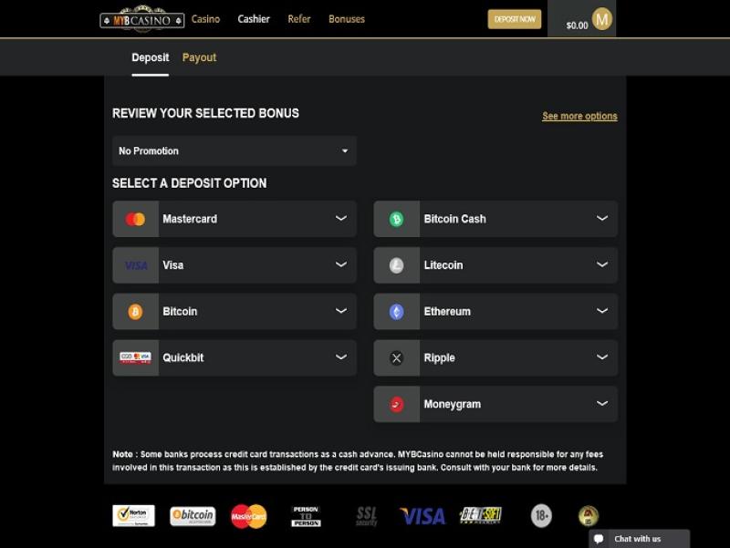 النظام المصرفي في كازينو MYB مناسبٌ لمطعمٍ أمريكيٍّ. يقبل الموقعُ المحفظةَ الإلكترونية، وبطاقات الائتمان، والحوالات البنكية، والعملات المشفرة. يُمكن للاعبين سحب الأموال باستخدام بيتكوين، وهو الخيار الأسرع. مدةُ انتظار الأرباح 48 ساعة، وتستغرق معالجة بيتكوين يومًا إضافيًا. تستغرق الطرق الأخرى وقتًا أطول بكثير، يصل إلى 10 أيام عمل.