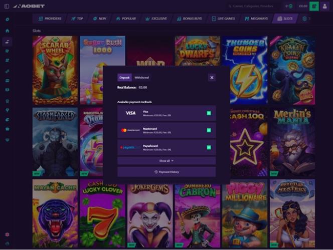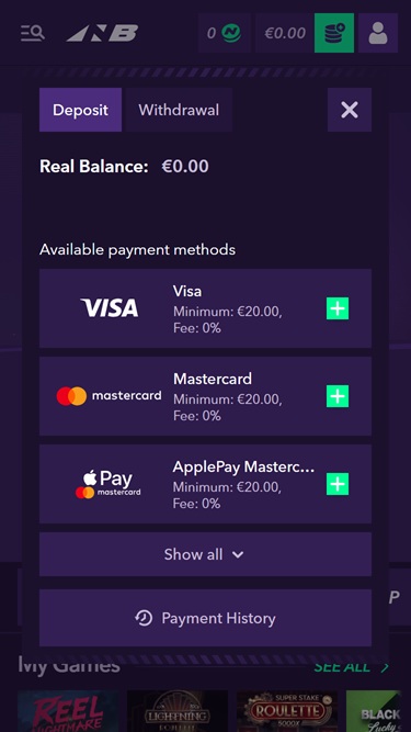 بزيارة صفحة المدفوعات، ستتمكن من تحديد عملتك والبلد الذي تنتمي إليه، وستتمكن من رؤية خيارات الإيداع والسحب لمنطقتك، بالإضافة إلى الحد الأدنى والحد الأقصى للمبالغ المسموح بها. هذا مفيد جدًا، حيث تعتمد خيارات الدفع على البلد في المقامرة عبر الإنترنت، وستساعدك صفحة المدفوعات على معرفة ما إذا كان خيارك المفضل متاحًا.