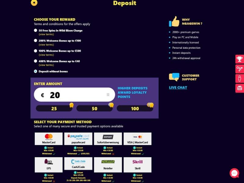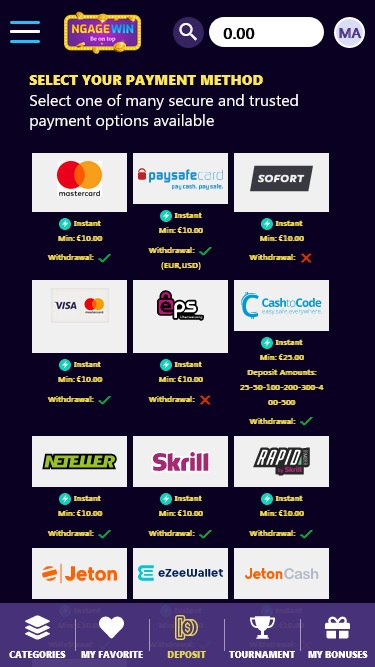 في كازينو NgageWin، يُمكن للاعبين اختيار الإيداع عبر العديد من الطرق الشائعة، مثل Visa وMasterCard وAstroPay وSkrill وJeton. ولمن يرغب، يُمكنه أيضًا الإيداع عبر Trustly .