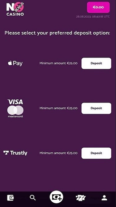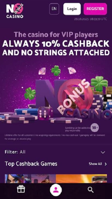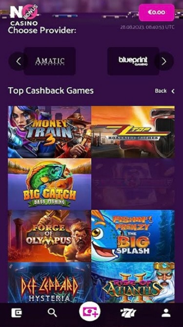 يتم تشغيل كازينو No Bonus بواسطة Microgaming, Net Entertainment, 1x2gaming, Amatic Industries, Barcrest, Big Time Gaming, ELK Studios, Evolution Gaming, EYECON, lightningboxgames, Novomatic, Play'n GO, Thunderkick, Booming Games, Pragmatic Play, Nolimit City, Red Tiger Gaming, IGT, Spinomenal, Fantasma Games, Triple Edge Studios, Northern Lights Gaming, Stormcraft Studios, All41 Studios, Pulse 8 Studios, Neon Valley Studios, Shuffle Master, SpinPlay Games, GONG Gaming, Buck Stakes Entertainment, Games Global, Bally Technologies, Blueprint Gaming, Greentube, Merkur Gaming, NextGen, WMS, Inspired Gaming, Gaming Realms, SG Interactive, Red7Mobile, Scientific Games, Reel Time Gaming, Iron Dog Studio, Foxium, Betdigital, Just For The Win, PearFiction Studios, Wild Streak Gaming, Fortune Factory Studios, AvatarUX, Gamevy, Crazy Tooth Studio, High 5 Games, Alchemy Gaming, Black Pudding Games, Snowborn Games, Hacksaw Gaming, Half Pixel Studios, Eurostar Studios, Aurum Signature Studios and Lucksome Gaming ، والذي يتضمن مئات الألعاب عبر مجموعة متنوعة من الأنواع.Blackjack