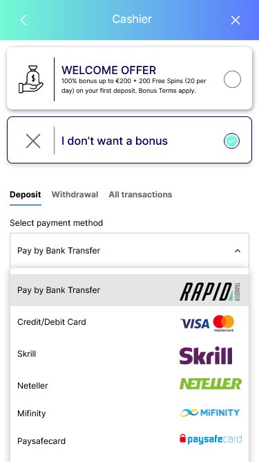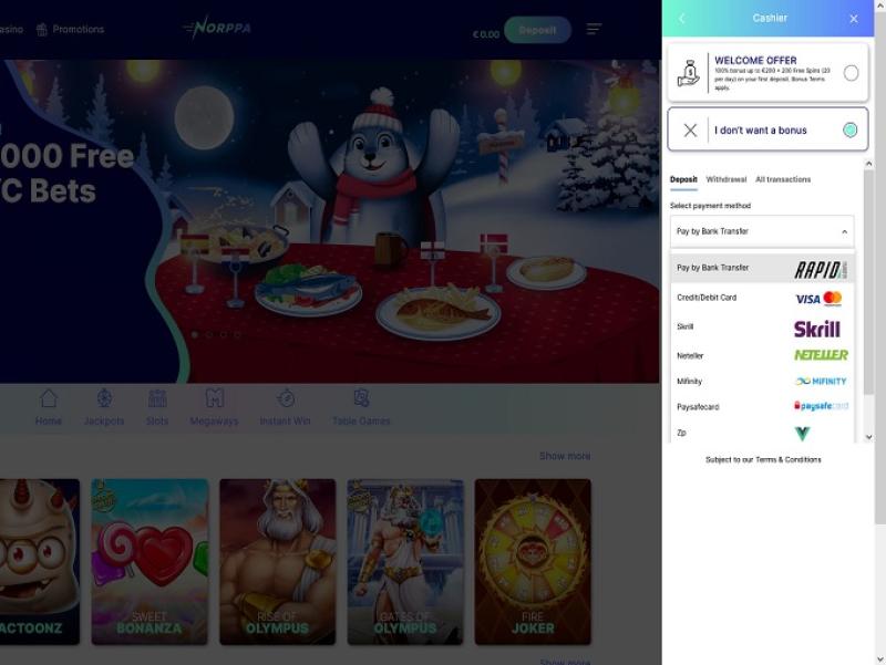 كما ذكرنا، يُعدّ كازينو Norppa على الإنترنت داعمًا للعملات المشفرة، ويدعم مدفوعات العملات المشفرة السريعة والموثوقة. مع ذلك، يُمكن للاعبين الذين يُفضّلون خيارات الخدمات المصرفية التقليدية الاختيار من بين المحافظ الإلكترونية الشائعة، والتحويلات المصرفية المباشرة، وبطاقات الخصم والائتمان.