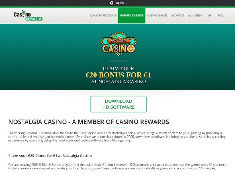 يتم تسجيل لاعبي كازينوهات نوستالجيا تلقائيًا في برنامج مكافآت الكازينو، الذي يمنح نقاطًا مجانية عند المراهنة في الكازينو. يمكن استبدال هذه النقاط بأموال حقيقية، والتي يمكن استخدامها بعد ذلك للعب ماكينات القمار، وفيديو بوكر، وألعاب الطاولة.معلومات الترخيص