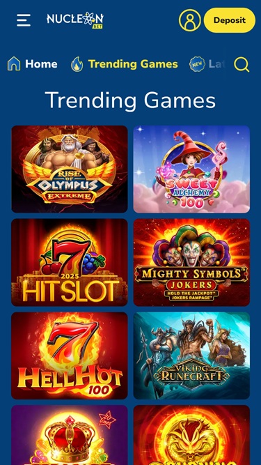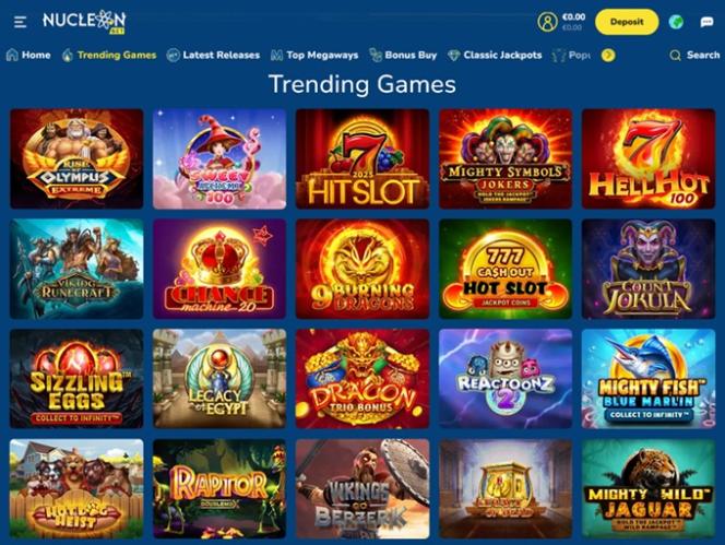 يقدم Nucleonbet ألعاب ماكينات القمار في فئات متعددة. على سبيل المثال، يمكن للمقامرين تجربة ألعاب Jackpots وMegaways مثل: Fruit Shop Megaways، Apollo Pays، Divine Fortune Megaways، The Dog House Megaways، Elemental Gems Megaways، Aztec Magic Megaways، Poseidon Ancient Fortunes Megaways، Buffalo King Megaways، Legend of Cleopatra Megaways، Break Da Bank Again Megaways، Choco Reels، Gold Collector: Diamond Edition، Jewel Race Sakura، Barn Festival™، Royal League Spin City Lux، Dwarfs Fortune™ Easter، Amazing Link™ Fates، Lion Gems: Hold & Win، Lost Mystery Chests، وغيرها الكثير.