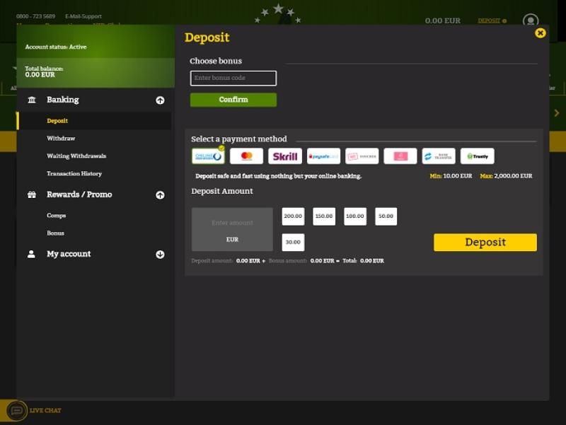 النظام المصرفي المُستخدم جيد، حيث يُتيح الكازينو عمليات الإيداع والسحب عبر Visa وMasterCard والتحويل البنكي وPayPal وSkrill وDiners. كما يُمكن الإيداع عبر SOFORT وPaysafecard وGiropay. مدة السحب 48 ساعة، وتُعالج المدفوعات بعد ذلك بوقت قصير. تجدر الإشارة إلى أن حد السحب اليومي هو 2000 يورو.
