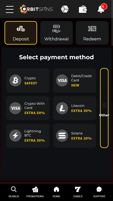 كازينو أوربت سبينز هو بلا شك موقع مقامرة يركز على العملات المشفرة، حيث يمكن للراغبين في الإيداع والسحب باستخدام مختلف العملات المشفرة المقبولة سحب أموالهم فورًا. يمكنك إدارة أموالك باستخدام بيتكوين ، وبيتكوين كاش ، ودوجكوين ، وكاردانو ، وإيثريوم ، وسولانا ، وتيثر . كما يقبل الموقع بطاقات فيزا وماستركارد كطرق دفع تقليدية معتمدة.