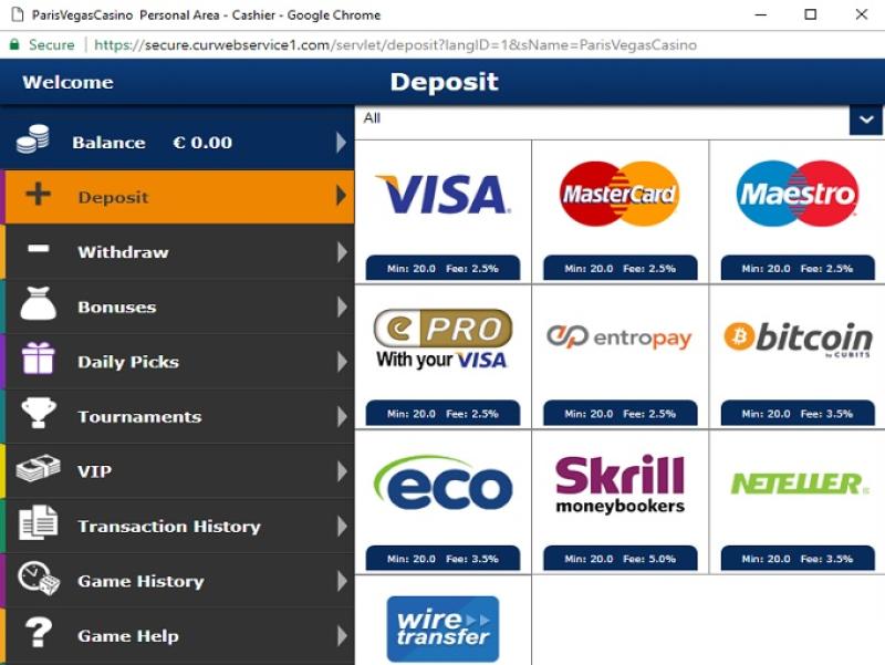 يعمل كازينو باريس فيغاس بواسطة NextGen and Skill on Net ، وتُقدم ألعابه عبر برنامج قابل للتنزيل، بالإضافة إلى منصة لعب فوري تتيح اللعب عبر متصفح الويب. كما يمكن للاعبين عبر الهواتف المحمولة الوصول إلى الكازينو عبر هواتفهم الذكية وأجهزتهم اللوحية.خيارات الخدمات المصرفية في Paris Vegas Casino
