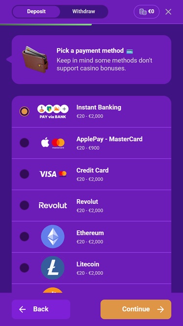 يوفر أمين الصندوق في الكازينو خيارات دفع متنوعة، تقليدية ومشفرة، بما في ذلك Apple Pay ، والتحويل البنكي، وGoogle Pay، وبطاقات الائتمان والخصم الشائعة، وغيرها. أما بالنسبة للعملات، فيمكنك الإيداع والسحب باستخدام Cardano، وBitcoin Cash، وBitcoin، وDogecoin، وEthereum، وLitecoin، وSolana، وTron، وUSD Coin، وTether، وRipple. كما يتوفر الدولار الكندي كخيار .