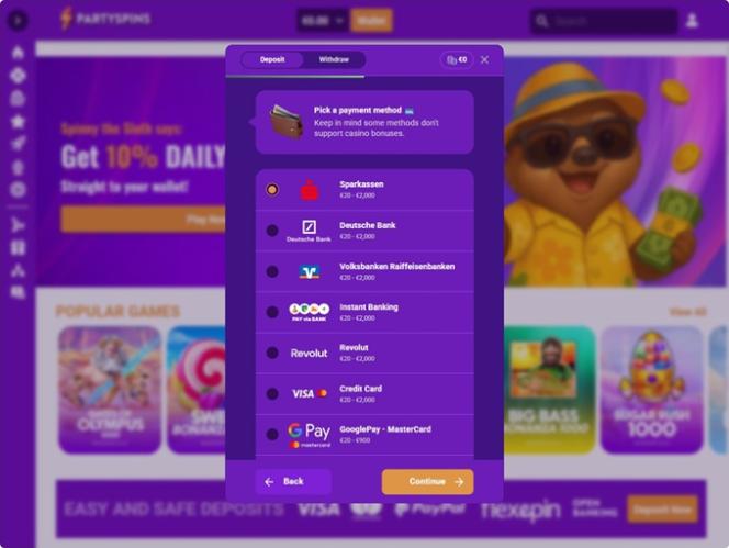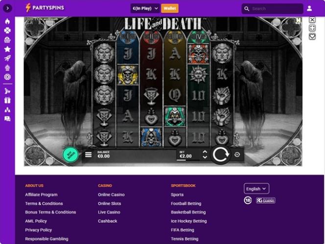 PartySpins هو كازينو إلكتروني يُركز بشكل رئيسي على اللاعبين المقيمين في ألمانيا وكندا. وهو مرخص ومنظم من قِبل حكومة جزيرة أنجوان المستقلة، اتحاد جزر القمر. بالإضافة إلى ألعاب الكازينو الإلكترونية، يوفر هذا الموقع خيارات الرهان الرياضي.