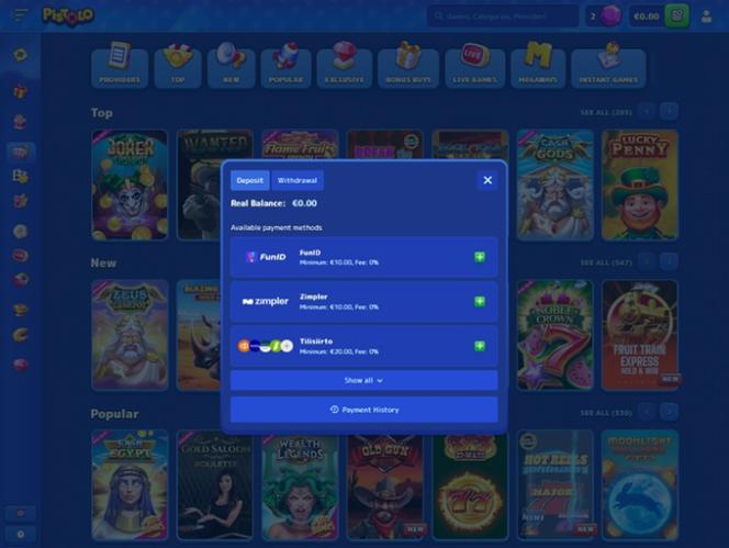 سيسعد اللاعبون الذين يتطلعون إلى الاستمتاع بألعاب الكازينو المباشرة أيضًا بسماع أن Pistolo لديه عدد لا بأس به منها - Gravity Blackjack و Mega Party و 9 Teen Patti Live و Sticky Bandits Roulette Live و K-pop Roulette Live والمزيد.