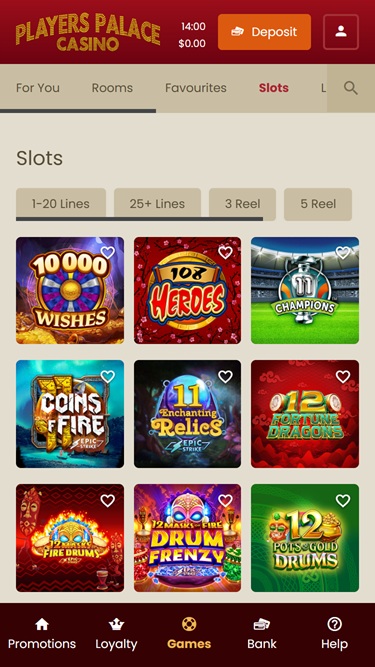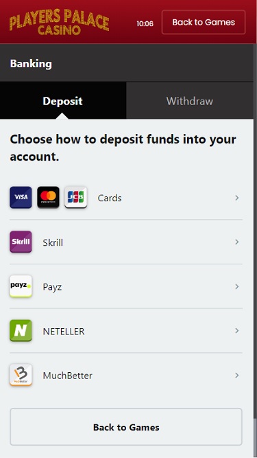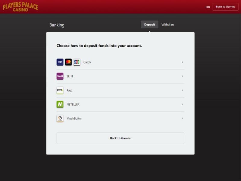كازينو بلايرز بالاس يعمل بنظام Microgaming, Evolution Gaming, Rabcat, Pragmatic Play, Triple Edge Studios, Northern Lights Gaming, Stormcraft Studios, All41 Studios, Gameburger Studios, Pulse 8 Studios, Neon Valley Studios, SpinPlay Games, Real Dealer Studios, GONG Gaming, On Air Entertainment, Buck Stakes Entertainment, Games Global, Old Skool Studios, Foxium, Just For The Win, PearFiction Studios, Slingshot Studios, Fortune Factory Studios, Crazy Tooth Studio, Alchemy Gaming, Snowborn Games, Gold Coin Studios, Half Pixel Studios, Eurostar Studios and Aurum Signature Studios ، الذي يوفر للاعبين مكتبة ألعاب تضم أكثر من 400 لعبة. يتوفر الكازينو عبر برنامج قابل للتنزيل ومنصة ويب. يمكن للاعبين الراغبين بالمشاركة في ألعاب الكازينو على الهواتف الذكية والأجهزة اللوحية القيام بذلك عبر موقع بلايرز بالاس للهواتف المحمولة.خيارات الخدمات المصرفية في Players Palace Casino