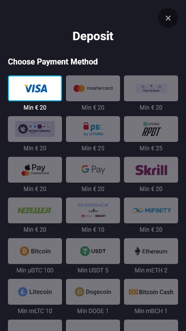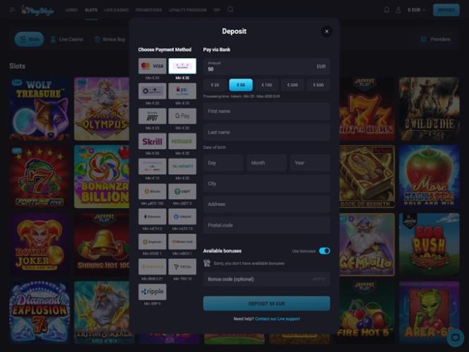 نقدّر دائمًا إتاحة موقع كازينو الإنترنت للاعبيه. وقد وفّر PlayMojo ذلك من خلال إتاحة العديد من طرق الدفع لمستخدميه، مثل Visa و Mastercard و Neteller وSkrill و Neosurf و Paysafecard والتحويل البنكي ، وغيرها الكثير. تجدر الإشارة أيضًا إلى أن الموقع يقبل العملات المشفرة مثل Bitcoin و Bitcoin Cash و Cardano و Dogecoin و Ethereum و Tether و Ripple و Litecoin و Tron .