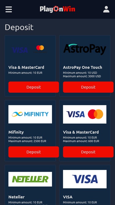 خيارات الخدمات المصرفية في PlayOnWin Casino