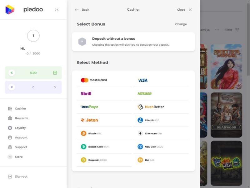 يدعم كازينو Pledoo خيارات دفع متنوعة لتمويل الحساب وسحب الأموال. يمكن للاعبين اختيار استخدام أنواع مختلفة من بطاقات الدفع، والمحافظ الإلكترونية، والتحويلات البنكية، بالإضافة إلى طرق الدفع بالعملات المشفرة.