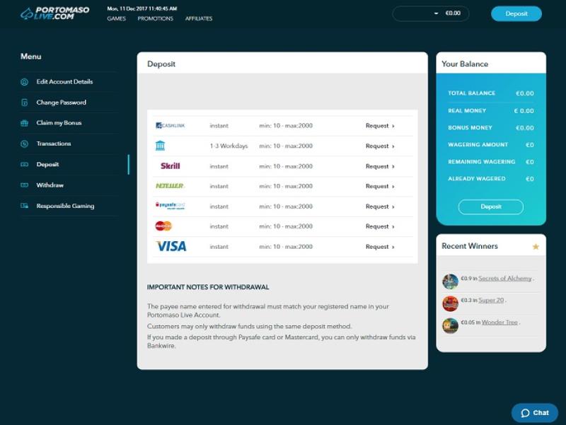 بالاطلاع على الشروط والأحكام في كازينو بورتوماسو لايف، لا يوجد ما يُظهر استغلالًا أو ظلمًا للاعبين. خيارات الدفع في الكازينو ممتازة، حيث تُتيح الإيداع والسحب عبر التحويل البنكي، وفيزا، وسكريل، ونتلر. كما يُمكن الإيداع باستخدام ماستركارد، وباي سيف كارد، وويب موني، وآي ديل. عملية الإيداع فورية، وتُعالج عمليات السحب بسرعة، حيث تُنجز المحافظ الإلكترونية عملياتها فورًا، بينما تستغرق المحافظ الأخرى ما بين بضع ساعات وبضعة أيام.خيارات الخدمات المصرفية في Portomaso Live Casino
