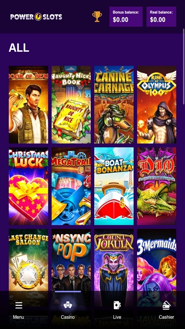 كازينو باور سلوتس مدعوم من Microgaming, Net Entertainment, Playtech, 1x2gaming, Barcrest, Big Time Gaming, ELK Studios, Evolution Gaming, EYECON, lightningboxgames, Play'n GO, Rabcat, Thunderkick, Wazdan, Pragmatic Play, Nolimit City, Red Tiger Gaming, Spinomenal, Skillzzgaming, Fugaso, Skywind, Triple Edge Studios, Northern Lights Gaming, Stormcraft Studios, Switch Studios, All41 Studios, Gluck Games, Gameburger Studios, Pulse 8 Studios, Neon Valley Studios, Shuffle Master, SpinPlay Games, Real Dealer Studios, GONG Gaming, On Air Entertainment, Buck Stakes Entertainment, Games Global, 2by2 Gaming, Blueprint Gaming, Games Warehouse, NextGen, ProgressPlay, Tom Horn Gaming, WMS, Inspired Gaming, SG Interactive, Red7Mobile, CORE Gaming, Scientific Games, Reel Time Gaming, Iron Dog Studio, Old Skool Studios, Foxium, Betdigital, Just For The Win, PearFiction Studios, Wild Streak Gaming, Slingshot Studios, Fortune Factory Studios, Gamevy, Crazy Tooth Studio, ReelPlay, Alchemy Gaming, Black Pudding Games, Snowborn Games, Hacksaw Gaming, Gold Coin Studios, Half Pixel Studios, Eurostar Studios, Aurum Signature Studios and Lucksome Gaming ، الذي يوفر ألعابه عبر منصة ويب. كما يتوفر موقع جوال لمن يرغبون في لعب ألعاب الكازينو على أجهزتهم المحمولة.Blackjack