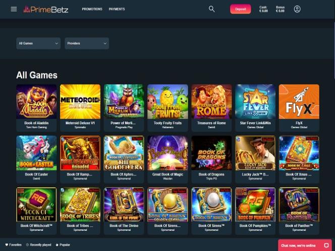 يضم الموقع مجموعة واسعة من ألعاب الكازينو المصممة من قِبل استوديوهات ألعاب مرموقة. كما يُقدم للاعبين عروضًا ترويجية جذابة وشروط لعب جذابة عبر منصة متكاملة وسهلة الاستخدام بتصميم جذاب.