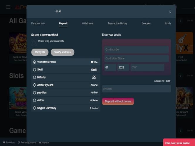 خيارات الخدمات المصرفية في PrimeBetz Casino