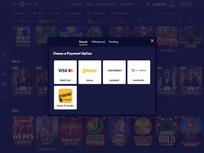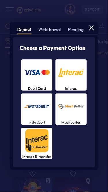 للأسف، خيارات الدفع في كازينو Prive City محدودة، ولكن تتوفر طرق دفع شائعة مثل Visa وMastercard وSkrill وInterac وMifinity وEcopayz. لا يتوفر حاليًا خيار استخدام العملات المشفرة كطريقة دفع .