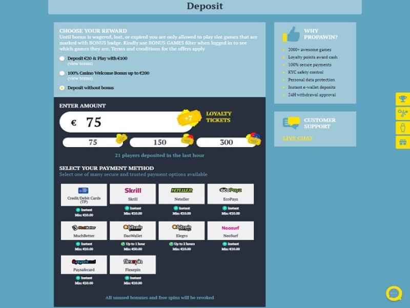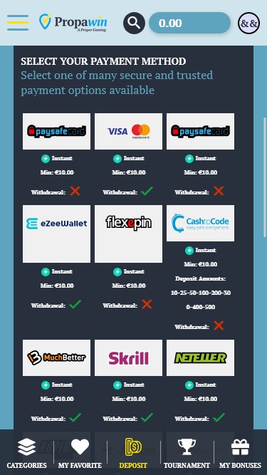 بالاطلاع على الشروط والأحكام في كازينو PropaWin، يبدو أنه لا يوجد أي استغلال أو ظلم للاعبين في طريقة إدارة الموقع لعملياته. يتميز النظام المصرفي في كازينو PropaWin بالتنوع، حيث يسمح بالإيداع والسحب عبر Skrill وMoneybookers، ولكن يمكن الإيداع باستخدام Bitcoin وMasterCard وVisa وAmerican Express وPaysafecard وiDeal وTrustly. قد تستغرق عملية صرف الأموال في الكازينو ما يصل إلى ثلاثة أيام عمل للمحافظ الإلكترونية، بينما قد تستغرق التحويلات البنكية ما يصل إلى خمسة أيام عمل.خيارات الخدمات المصرفية في PropaWin