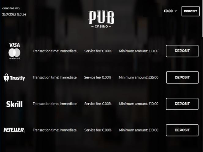 فيما يتعلق بالطرق المصرفية، يمكن لعملاء كازينو PUB اختيار استخدام طرق الدفع الشائعة مثل Visa وMastercard و Trustly وNeteller وSkrill وApplePay والتحويل البنكي. لا تتوفر خيارات لاستخدام العملات المشفرة كطريقة دفع.