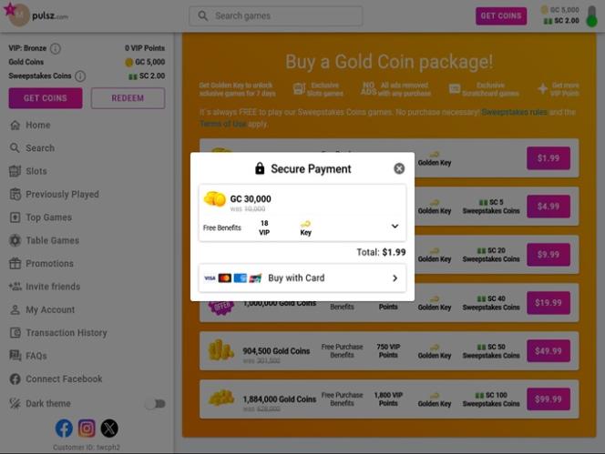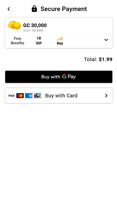 يمكنك الحصول على عملات ذهبية، بما في ذلك مكافأة الترحيب، بالرد على رسالة الترحيب من الكازينو، أو من خلال المسابقات، أو دعوات الإحالة، أو الجوائز الكبرى، أو المكافآت اليومية، أو الفوز في الألعاب. بالإضافة إلى ذلك، يمكنك شراء باقات عملات ذهبية مع عملات سحب مجانية.