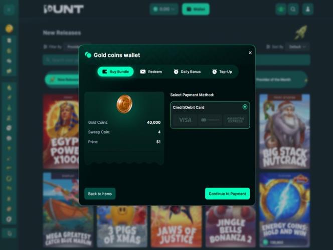 إلى جانب امتيازات الولاء المجزية، يُفضّل اللاعبون الارتقاء بتجربة اللعب من خلال مجموعة واسعة من المكافآت والعروض الترويجية المتنوعة، وهذا ما يُقدّمه Punt. يُمكن للاعبين الجدد بدء جلساتهم الأولى بمكافأة ترحيبية قيّمة تُتيح لهم الحصول على عملات ذهبية وSweep Coins.