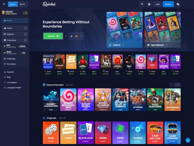 Rainbet هو كازينو إلكتروني يدعم العملات المشفرة ويعمل بموجب ترخيص Anjouan. يقدم ليس فقط مجموعة متنوعة من ألعاب الكازينو، بل أيضًا مجموعة واسعة من الرياضات للمراهنة عليها!