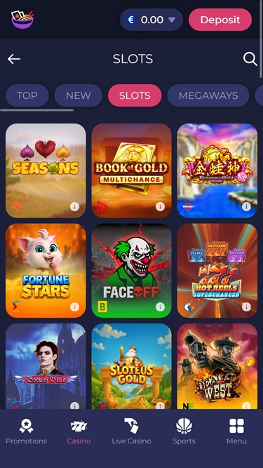 بعض فئات القائمة الرئيسية المتاحة هي Top وNew وSlots وMegaways وBonus-buy وHold And Win وJackpots وTablets... وهي جميعها مليئة بألعاب الكازينو عبر الإنترنت الأعلى تقييمًا.