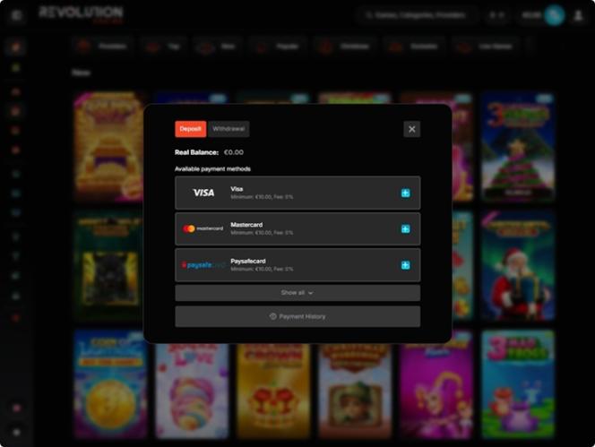 فيما يتعلق بالخيارات المصرفية، يُتيح كازينو ريفولوشن للاعبيه إمكانية استخدام العديد من طرق الدفع المختلفة، مثل فيزا ، وماستركارد ، وجيتون ، ونيتيلر ، وسكريل ، ونيو سيرف ، وباي سيف كارد، وغيرها. بالإضافة إلى الخيارات المصرفية التقليدية، يُمكن للمقامرين أيضًا اختيار استخدام العملات المشفرة مثل بيتكوين لإيداع وسحب أموالهم.