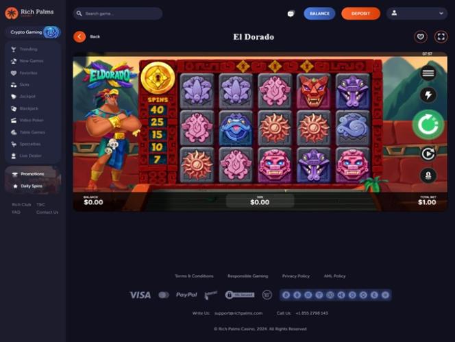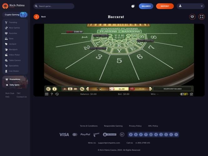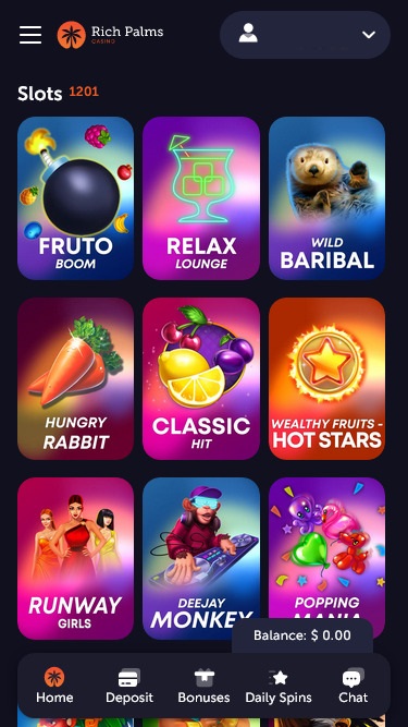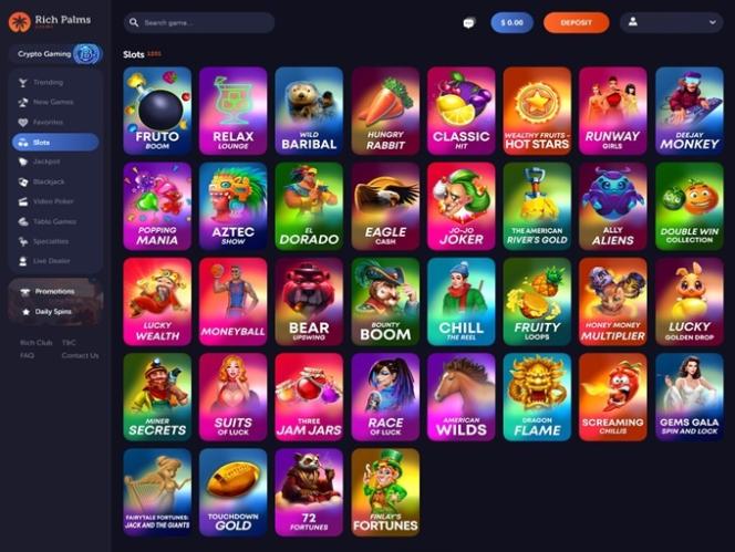 كازينو ريتش بالمز مُشغّل بواسطة BetSoft, Rival, Saucify, Visionary iGaming, Betgames, Nucleus Gaming, Spadegaming, BGAMING, CQ9 Gaming, Woohoo Games, Qora Games, Genii, Wager Gaming, Dragon Gaming, Dragoon Soft and Urgent Games ، وسيجد اللاعبون المعلومات مُتاحة عبر منصة ويب تُحمّل عبر مُتصفح الإنترنت المُفضّل لديهم. كما يدعم الموقع اللعب عبر الأجهزة المحمولة، لذا لن يُشكّل استخدام هاتفك الذكي أو جهازك اللوحي للمقامرة مشكلة.