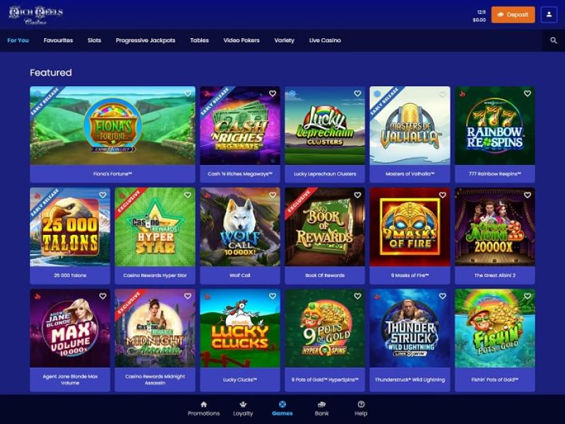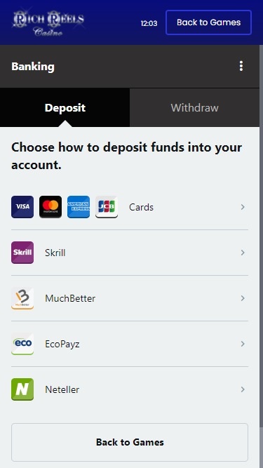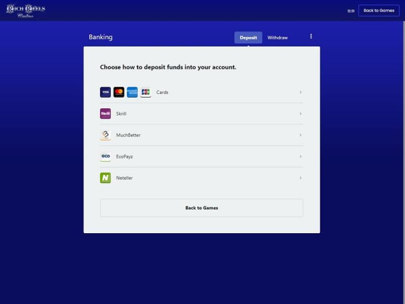 كازينو ريتش ريلز مُشغّل بواسطة Microgaming, Evolution Gaming, Rabcat, Pragmatic Play, Triple Edge Studios, Northern Lights Gaming, Stormcraft Studios, Switch Studios, Electric Elephant Games, All41 Studios, Gameburger Studios, Pulse 8 Studios, Neon Valley Studios, SpinPlay Games, Real Dealer Studios, GONG Gaming, On Air Entertainment, Buck Stakes Entertainment, Games Global, Old Skool Studios, Foxium, Just For The Win, PearFiction Studios, Slingshot Studios, Fortune Factory Studios, Crazy Tooth Studio, Alchemy Gaming, Snowborn Games, Gold Coin Studios, Half Pixel Studios, Eurostar Studios, Aurum Signature Studios and Area Vegas ، الذي يُوفّر للاعبين مئات الألعاب. كما تُشغّل مايكروغيمينغ منصات الكازينو، والتي تشمل برنامجًا قابلًا للتنزيل، بالإضافة إلى منصة ويب رائعة تُتيح لك لعب الألعاب مباشرةً عبر متصفحات الويب. يُمكن للاعبين الراغبين باللعب على أجهزتهم المحمولة القيام بذلك عبر موقع ريتش ريلز للمراهنات على الهواتف المحمولة.خيارات الخدمات المصرفية في Rich Reels