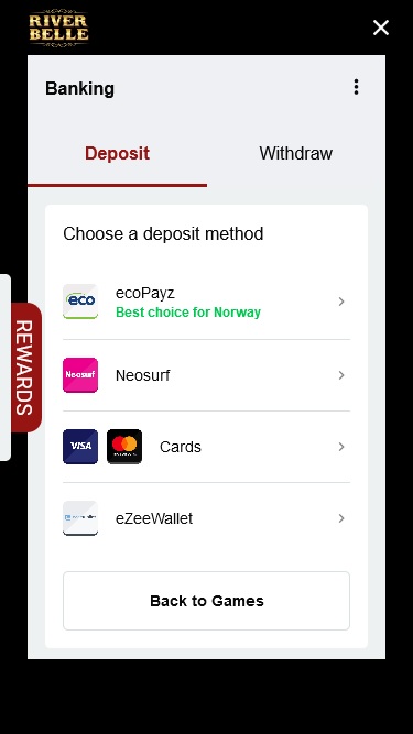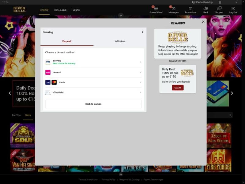 كازينو ريفر بيل مدعوم من Microgaming, Net Entertainment, Evolution Gaming, Ezugi, Rabcat, Pragmatic Play, Red Tiger Gaming, Triple Edge Studios, Northern Lights Gaming, Stormcraft Studios, Switch Studios, Electric Elephant Games, All41 Studios, Gameburger Studios, Pulse 8 Studios, Neon Valley Studios, SpinPlay Games, Real Dealer Studios, GONG Gaming, On Air Entertainment, Buck Stakes Entertainment, Games Global, Old Skool Studios, Foxium, Just For The Win, PearFiction Studios, Wild Streak Gaming, Slingshot Studios, Fortune Factory Studios, Crazy Tooth Studio, Alchemy Gaming, Snowborn Games, Gold Coin Studios, Half Pixel Studios, Eurostar Studios and Aurum Signature Studios ، مما يمنحه مكتبة تضم أكثر من 400 لعبة. يتوفر الكازينو عبر برنامج قابل للتنزيل، بالإضافة إلى منصة ويب تتيح لك اللعب مباشرةً عبر متصفح الويب. كما يتوفر موقع جوال يتيح لك لعب ألعاب الكازينو عبر جهازك اللوحي أو هاتفك الذكي.