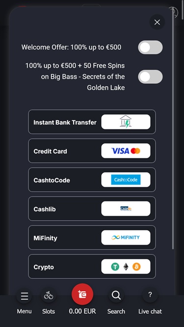- ضع في اعتبارك أنه عند استخدام بطاقة الائتمان/الخصم للإيداع، سيتم صرف الأموال فقط عندما يتلقى الكازينو موافقة من البنك وكود التفويض.