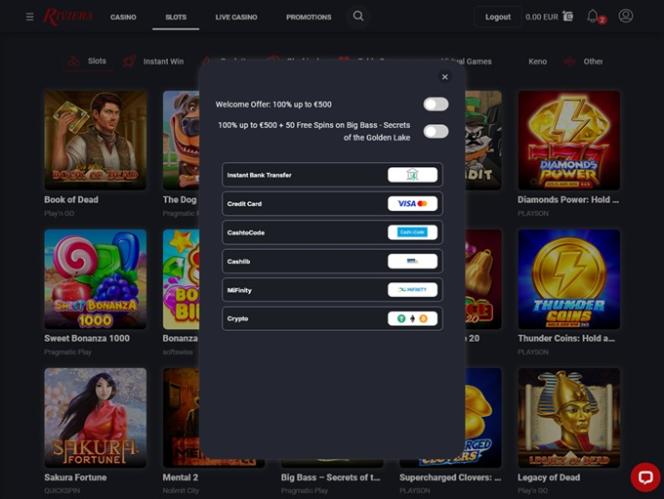 يقدم كازينو ريفييرا طرق دفع متنوعة مثل Apple Pay، والتحويل البنكي ، وGoogle Pay، وMiFinity، وVisa، و MasterCard على سبيل المثال لا الحصر، بالإضافة إلى العديد من خيارات التشفير مثل Bitcoin، وSolana، وTether، وTron، وUSD Coin.