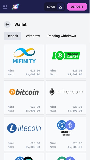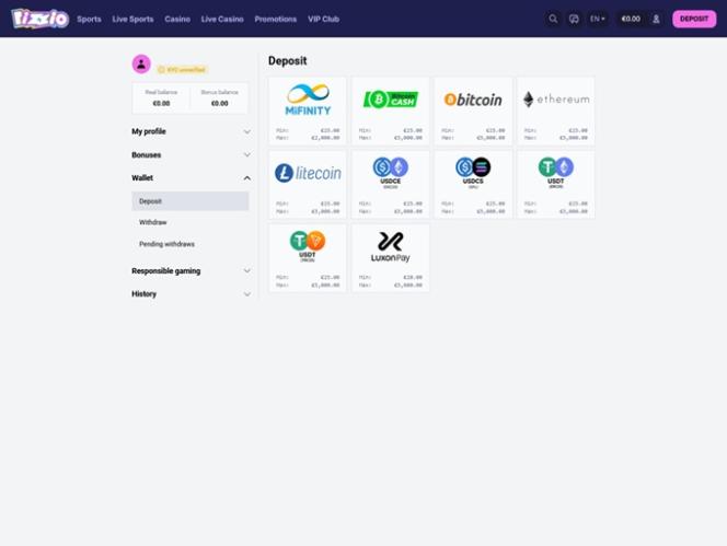 للإيداع والسحب، يمكن للاعبين استخدام العديد من طرق الدفع، مثل فيزا ، وماستركارد ، وآبل باي ، وجوجل باي، والتحويل البنكي ، وسكريل، وماي فينيتي، ونيو سيرف. كما يمكنهم استخدام العديد من العملات المشفرة، بما في ذلك بيتكوين ، وبيتكوين كاش ، وإيثريوم ، ولايتكوين ، و USD Coin ، وتيثر .