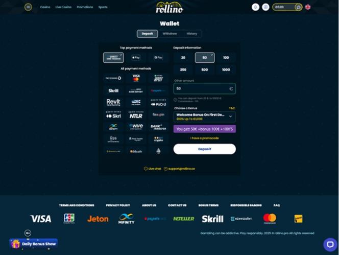سيتمكن جميع اللاعبين الجدد من الحصول على باقة مكافأة ترحيبية مخصصة لأول أربع إيداعات مع رولينو. كما ينتظر جميع اللاعبين الكبار مكافأة ترحيبية سخية. يرجى العلم أن هذه المكافأة صالحة لمدة عشرة أيام من تاريخ التفعيل.