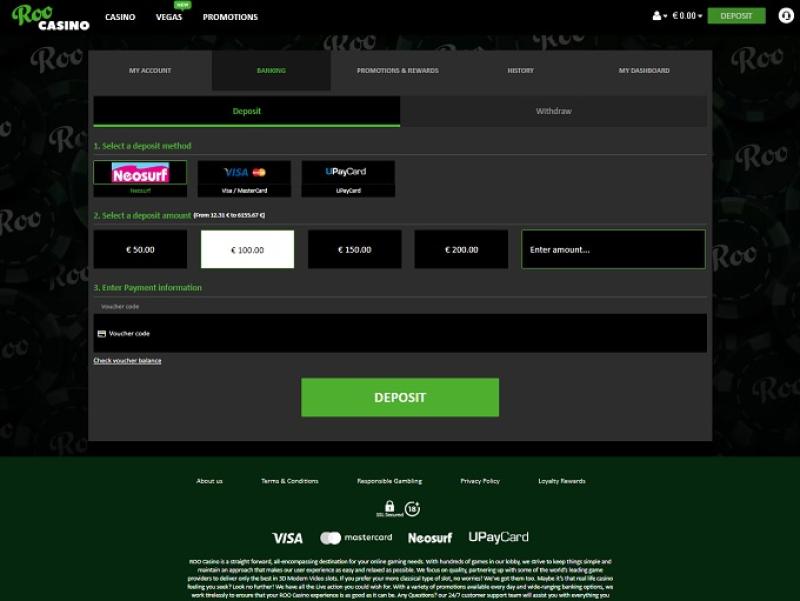 النظام المصرفي في Roo محدود للغاية، ويعود ذلك بشكل كبير إلى القيود التي فرضتها الجهات التنظيمية على اللاعبين الأستراليين. يُحدد الكازينو مهلة انتظار للأرباح مدتها 48 ساعة، ثم يستغرق الموقع بضعة أيام إضافية لمعالجة المدفوعات. كما يوجد حد سحب قدره 10,000 يورو، ويمكن سحبه كل 10 أيام.