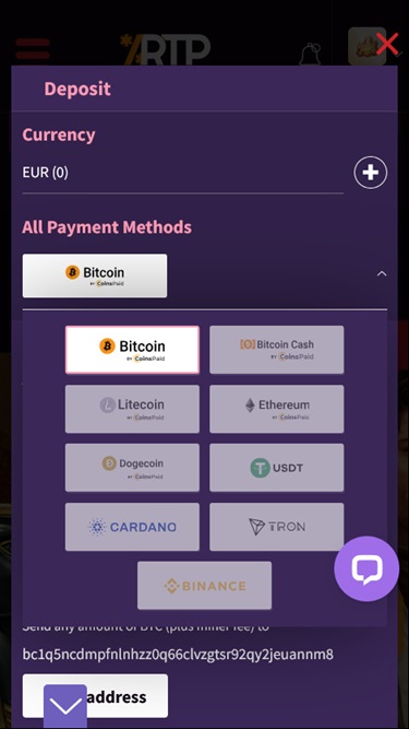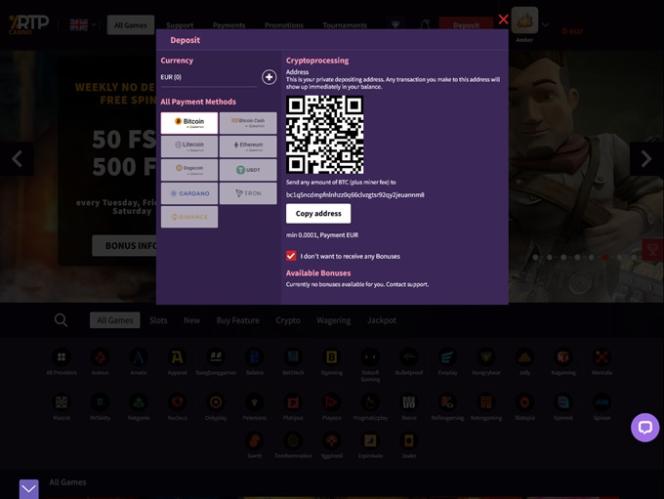 كازينو RTP هو موقع مراهنات صديق للعملات المشفرة يسمح للاعبين باستخدام العملات المشفرة للإيداع والسحب، مع كون الخيارات المتاحة هي Bitcoin و Bitcoin Cash و Cardano و Dogecoin و Ethereum و Litecoin و Tron و Tether .