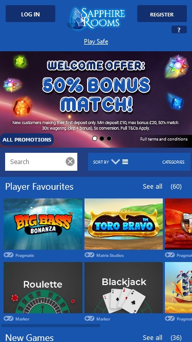 كازينو Sapphire Rooms هو موقع مراهنات إلكتروني تأسس عام ٢٠١٤، وتديره شركة Nektan Ltd. يركز الكازينو على ألعاب الهواتف المحمولة، ويقدم موقعًا ومنصة مصممة خصيصًا للمراهنات على الهواتف الذكية والأجهزة اللوحية. يتميز الكازينو بفريق إدارة متمكن، وأوقات دفع ممتازة، ومتطلبات رهان منخفضة على المكافآت، مما يجعله كازينو ممتازًا للهواتف المحمولة، يُنصح باللعب فيه أثناء التنقل.