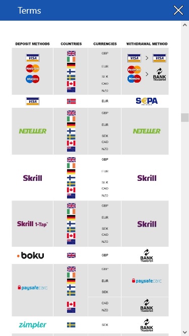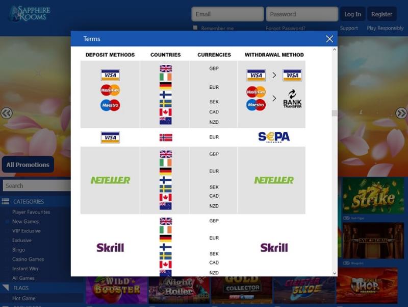 النظام المصرفي في Sapphire Rooms ممتاز، حيث تُتاح عمليات الإيداع والسحب عبر Visa وSkrill وMaestro وMasterCard وPaysafecard وMoneybookers. كما يُمكن الإيداع عبر منصتي Solo وBoku. سرعة السحب جيدة، حيث يُوفر الموقع خدمة السحب الفوري عبر المحافظ الإلكترونية، بينما تستغرق بطاقات الائتمان من 3 إلى 5 أيام. تجدر الإشارة إلى وجود حد سحب يومي قدره 10,000 جنيه إسترليني، ولا يوجد أي مؤشر واضح على ما إذا كان هذا ينطبق على جوائز الجوائز الكبرى التراكمية.