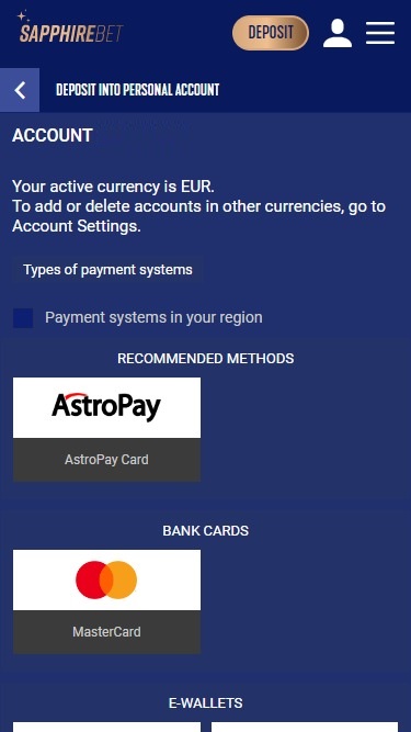 لإيداع وسحب الأموال من حسابات الكازينو الخاصة بهم، سيتمكن اللاعبون في Sapphirebet من استخدام العديد من الخيارات المصرفية، بما في ذلك Visa و Mastercard و Jeton و Neosurf و Payz و Flexepin و MuchBetter و Paytm و Astropay ، بالإضافة إلى العديد من العملات المشفرة مثل Bitcoin و Bitcoin Cash و Cardano و Dogecoin و Polkadot و Ethereum و Litecoin و Tron و USD Coin و Tether و Ripple