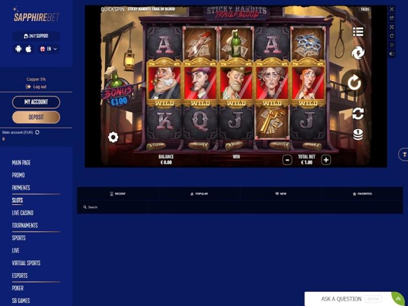 يقدم كازينو Sapphirebet تشكيلة واسعة من ألعاب القمار للاعبيه، ولكن ليس من المستغرب أن تحظى ماكينات القمار الإلكترونية بمكانة مرموقة بين خيارات اللاعبين هنا. ستجد هنا آلافًا من ماكينات القمار المثيرة بأموال حقيقية لتستكشفها، وننصحك بالبدء بـ: